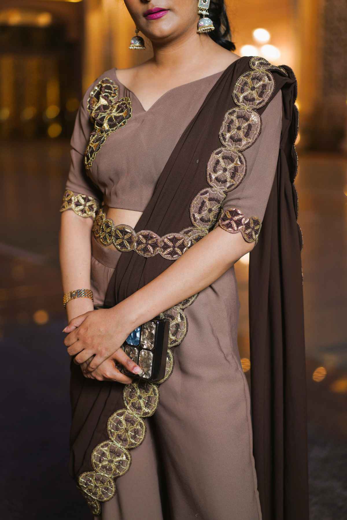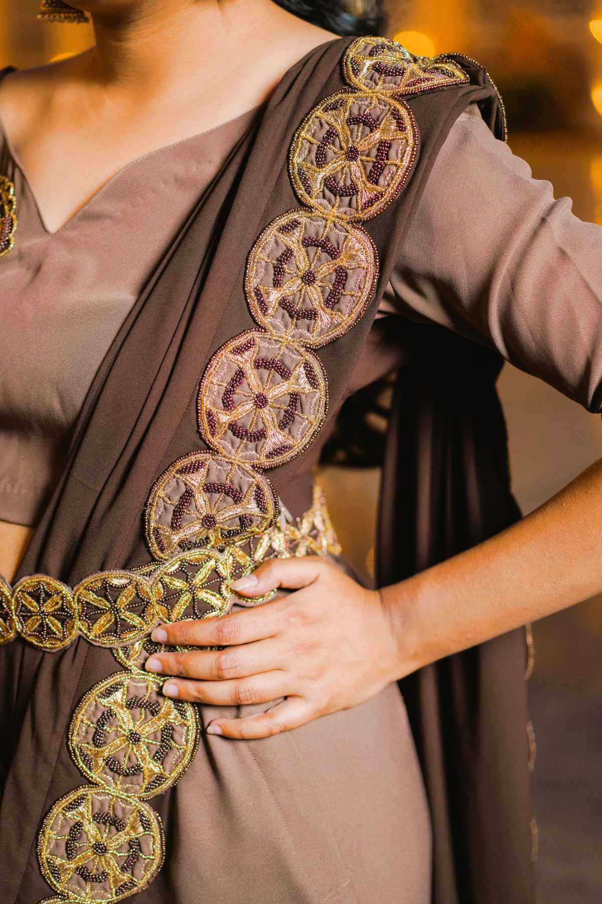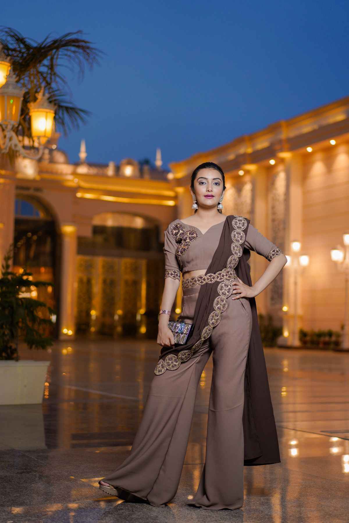 Enhance your elegance with this chocolate and light brown drape set in georgette. Featuring exquisite kasab and pearl embroidery, it offers a refined, luxurious look. The rich fabric and detailed embellishments make it perfect for any sophisticated occasion, ensuring you shine with timeless grace and style.